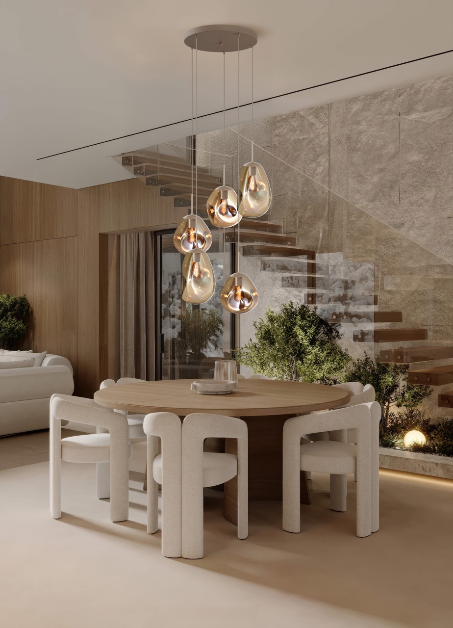 HL Lava 5-light beige terra, base beige terra Ø50cm 5x E27 pendant beige terra, beige pvc cable 220cm 2x glass gold Ø22,5x32cm + 3x glass gold Ø24x23cm