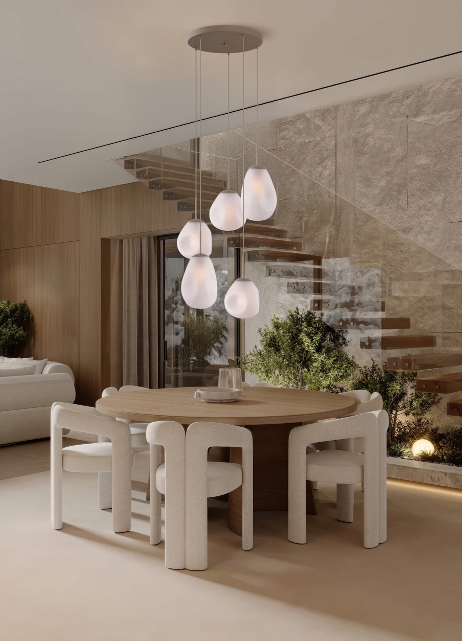 HL LAVA 5-LIGHT BEIGE TERRA, BASE BEIGE TERRA Ø50CM Art. 2762-36-50-5-06-1110HL Lava 5-light beige terra, base beige terra Ø50cm 5x E27 pendant beige terra, beige pvc cable 220cm 2x glass satin matt white Ø22,5x32cm + 3x glass satin matt white Ø24x23cm